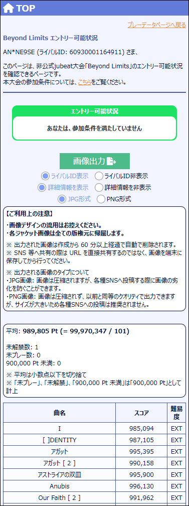 平均スコアが 995,000 Pt 以上の場合、エントリー条件を満たしています。